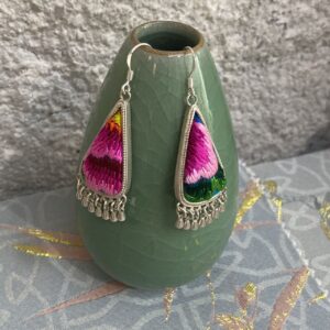 Handmade Miao embroidery silver earrings – pink and green patterns with tassels